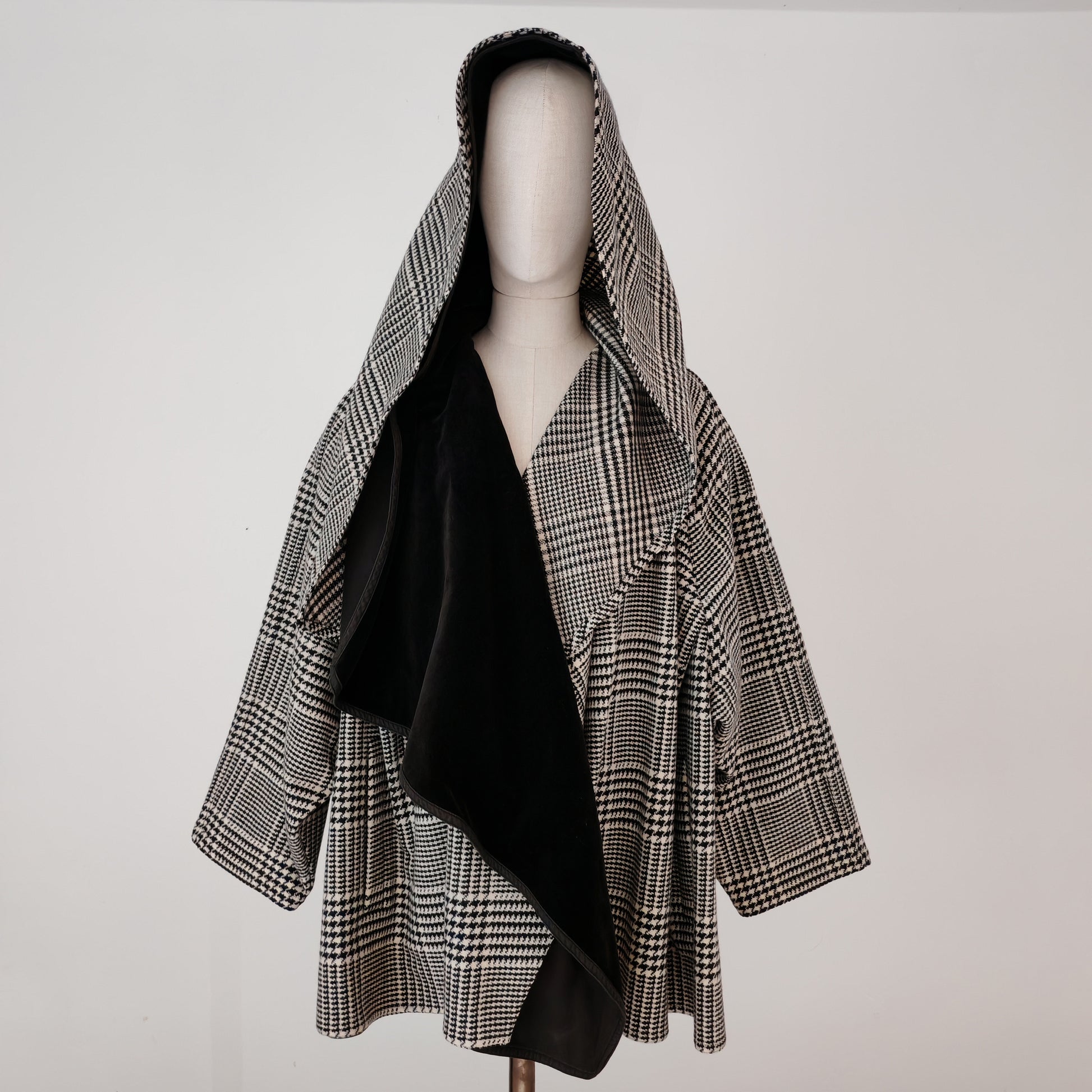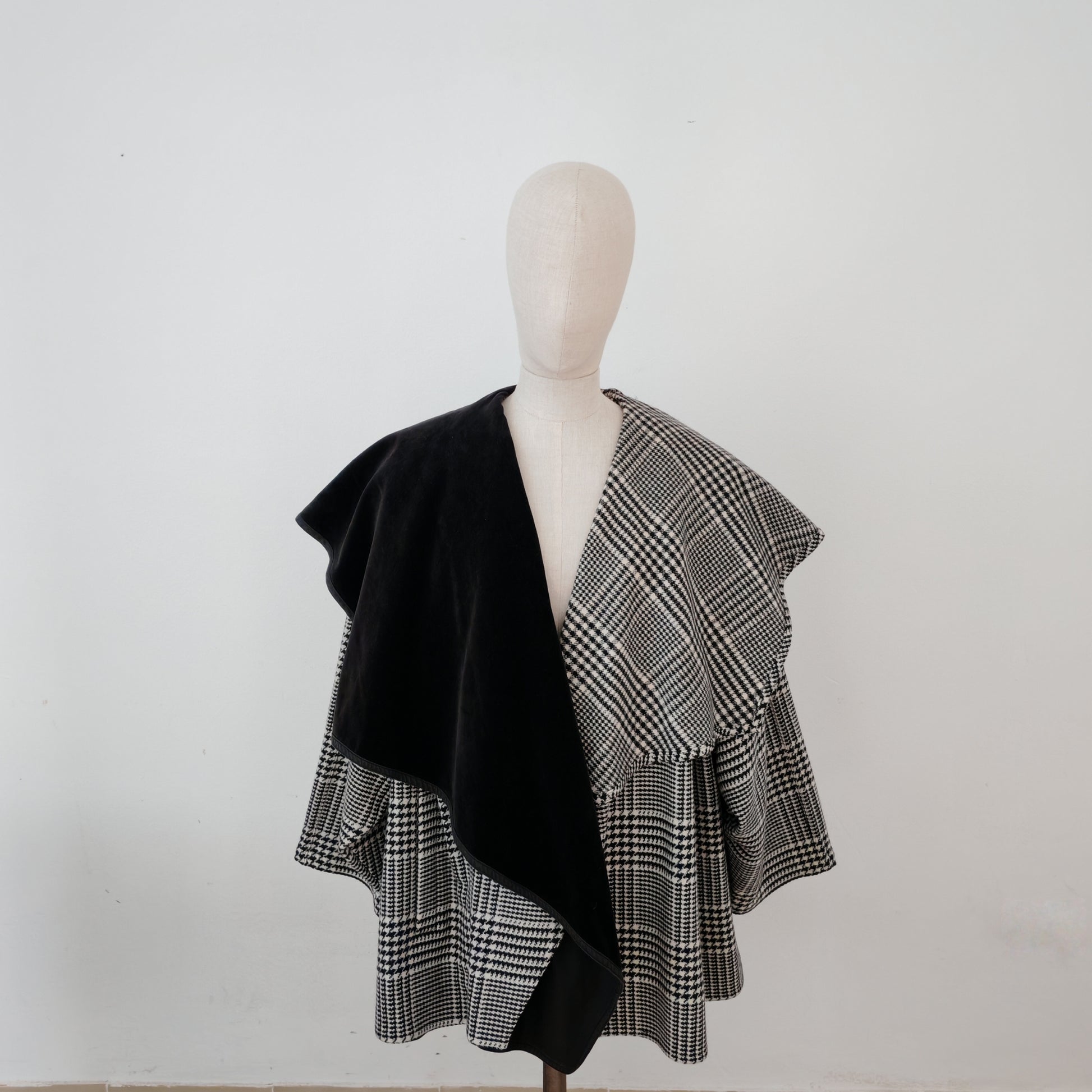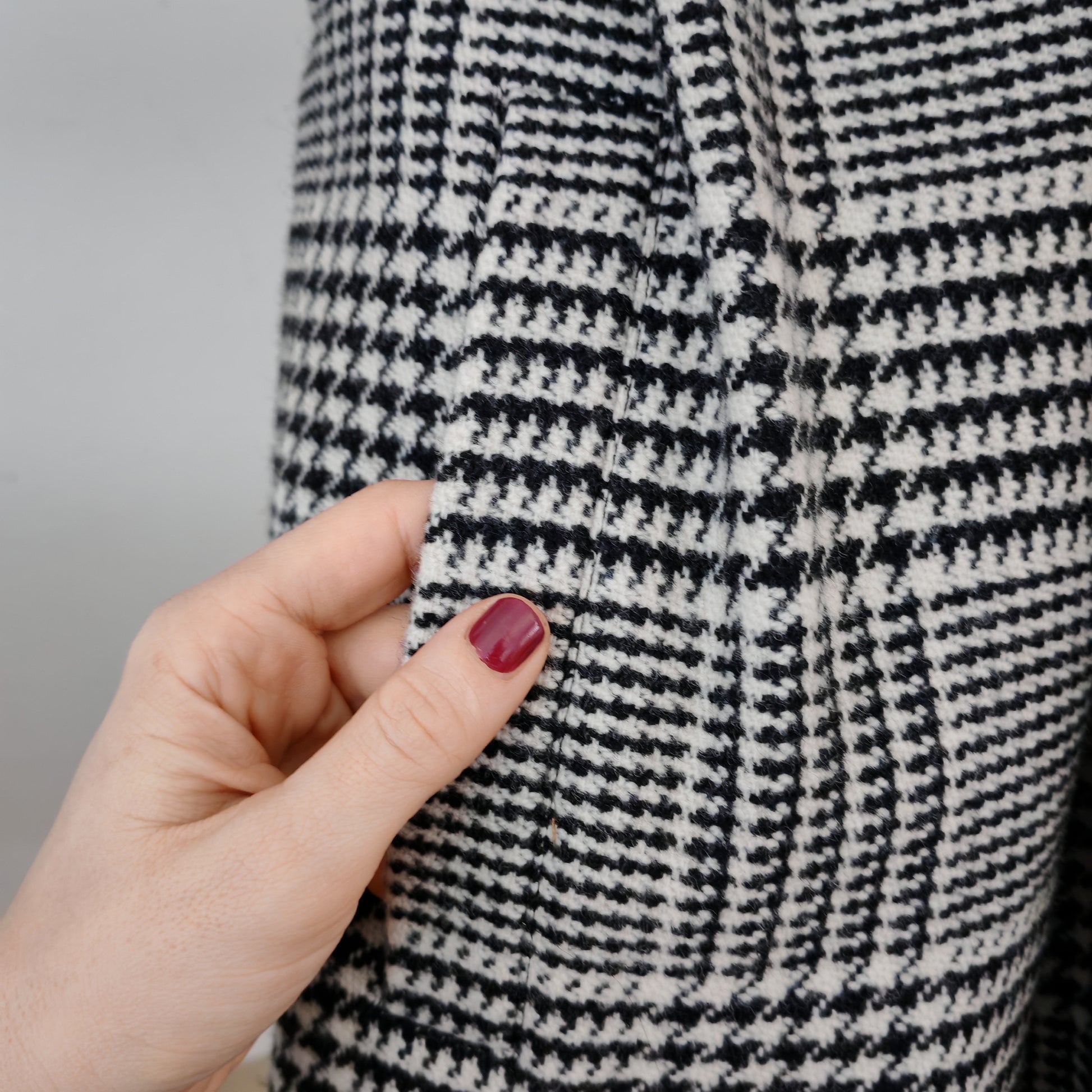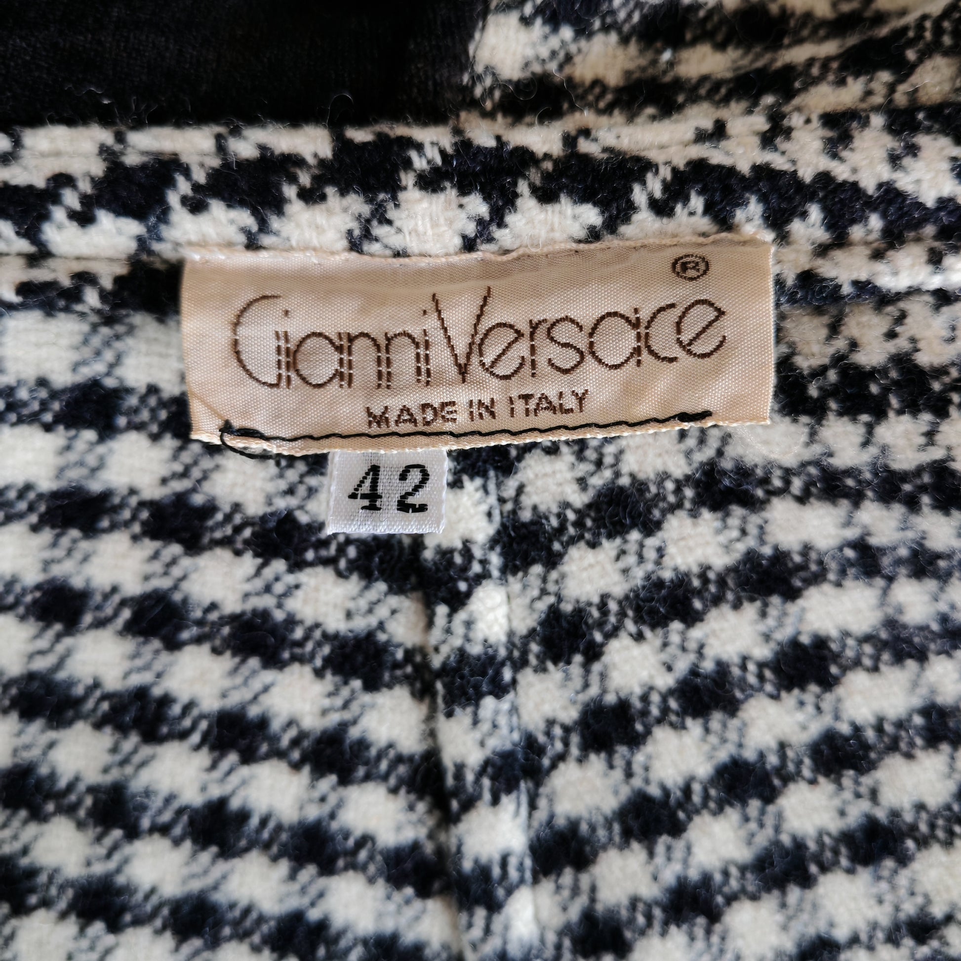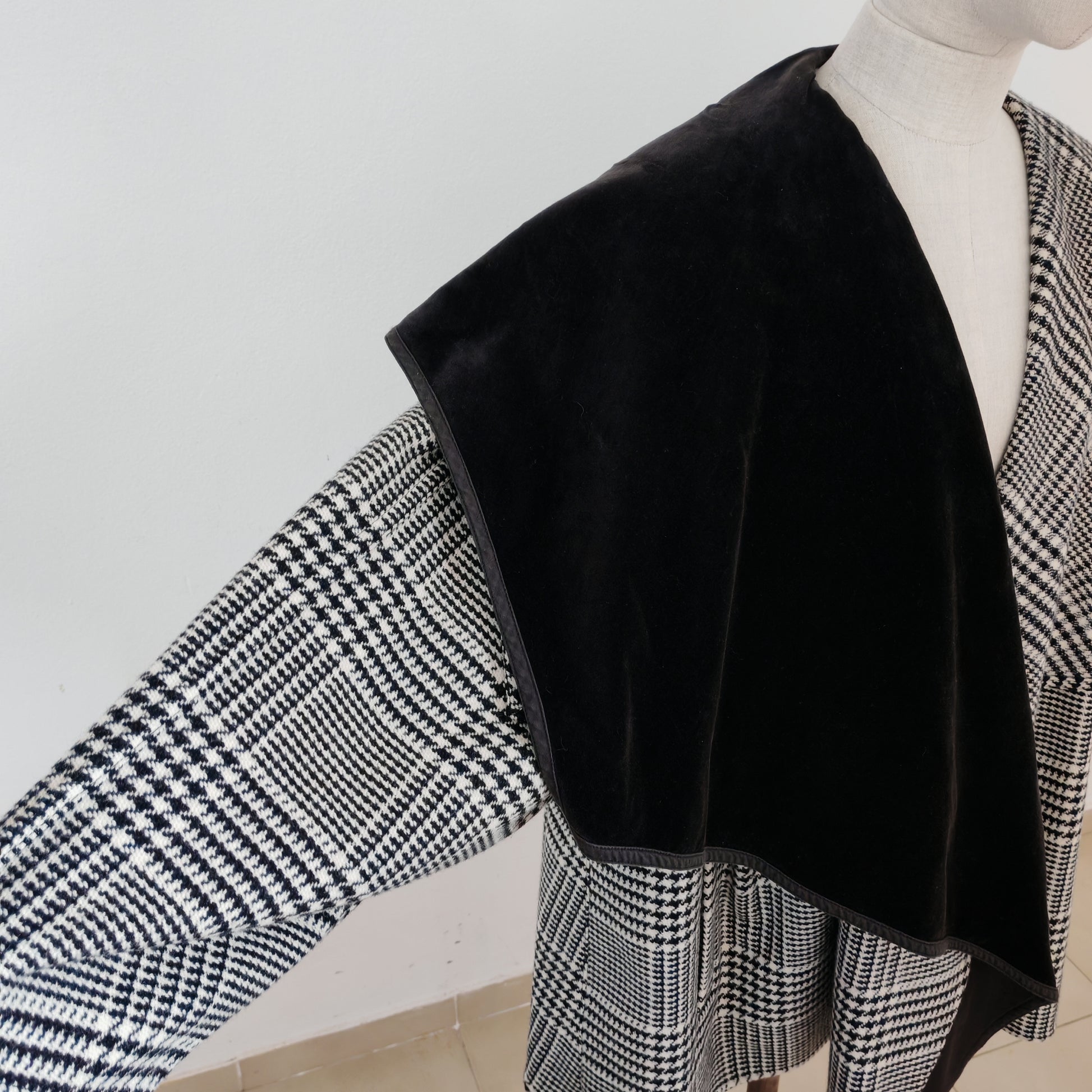 Questo straordinario capo firmato Gianni Versace fa parte della prima produzione dello stilista risalente agli anni 80 come si evince dall’etichetta in font “Avant Garde Light”. Si tratta di un raro pezzo realizzato con un tessuto in lana pied de poule bianco e nero sfoderato e sdoppiato in un lato da un inserto in velluto nero. È riportata una taglia 42 ma il taglio quasi a mezza ruota rende la vestibilità adatta a tutte le taglie. Sono presenti sui fianchi due tasche. Made in Italy