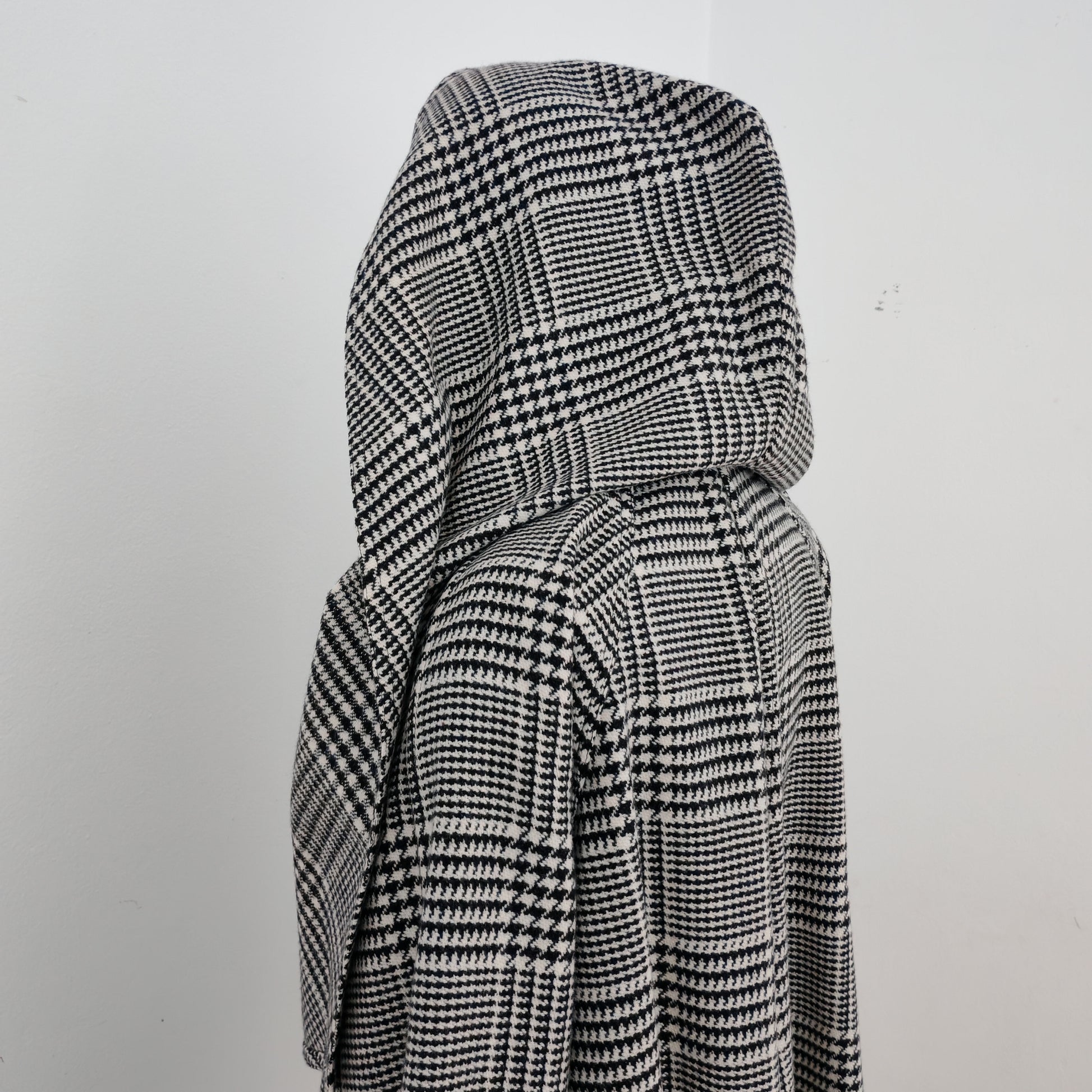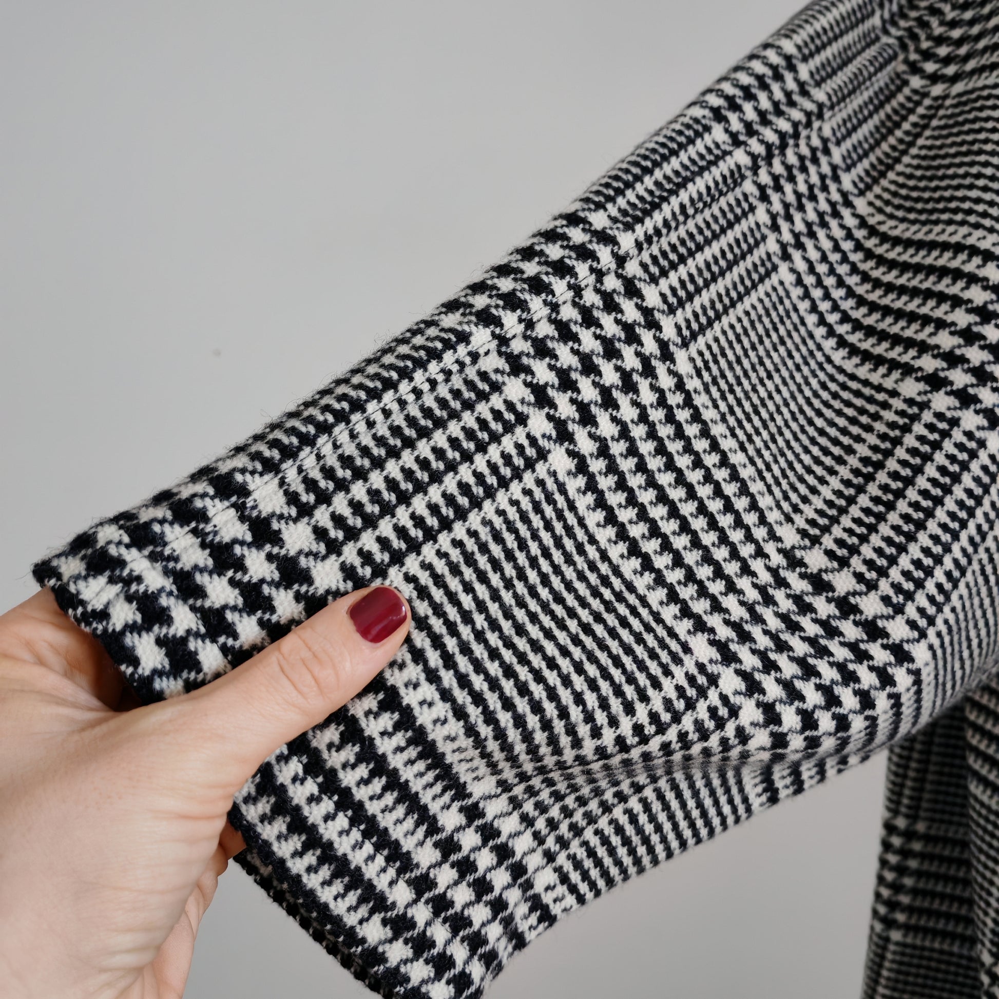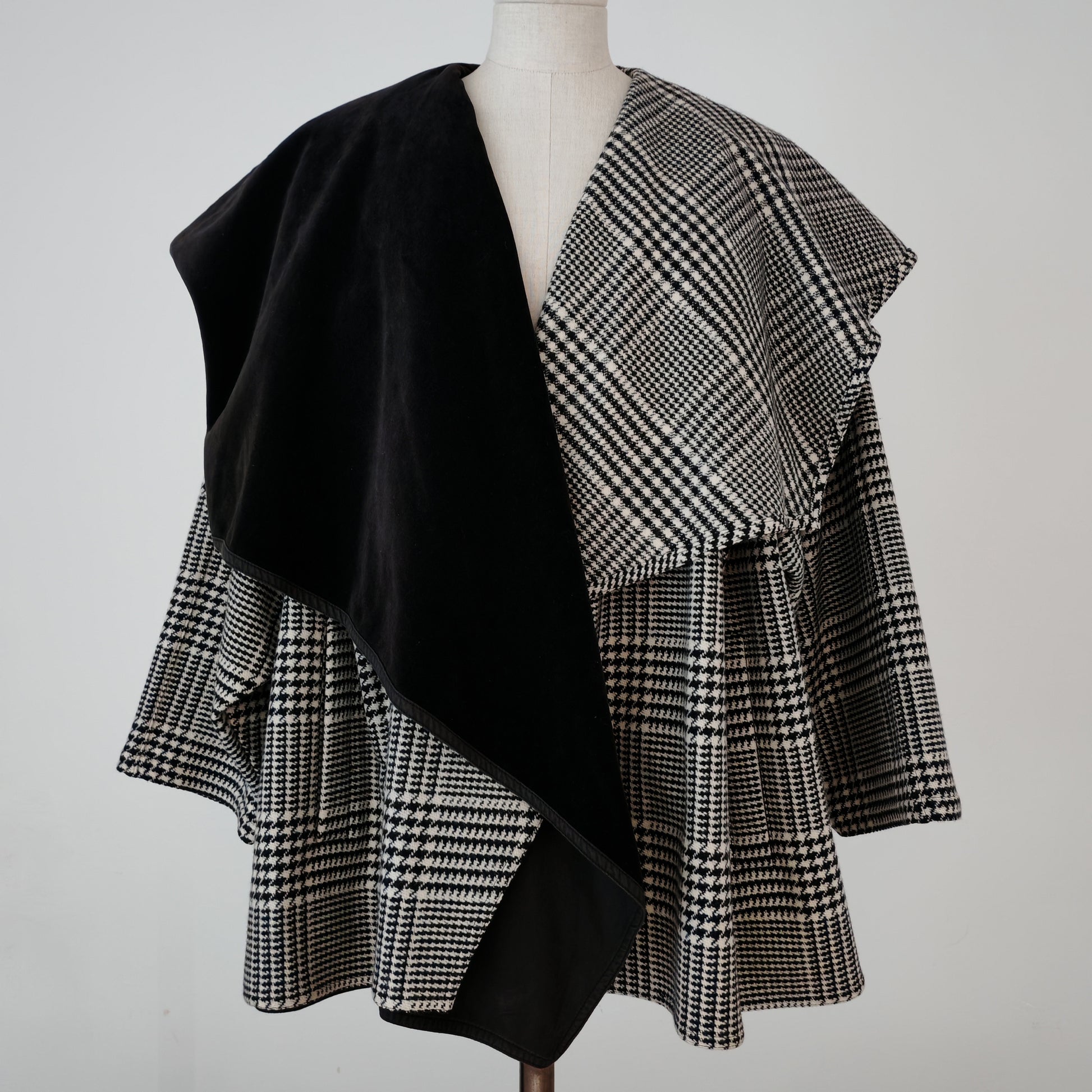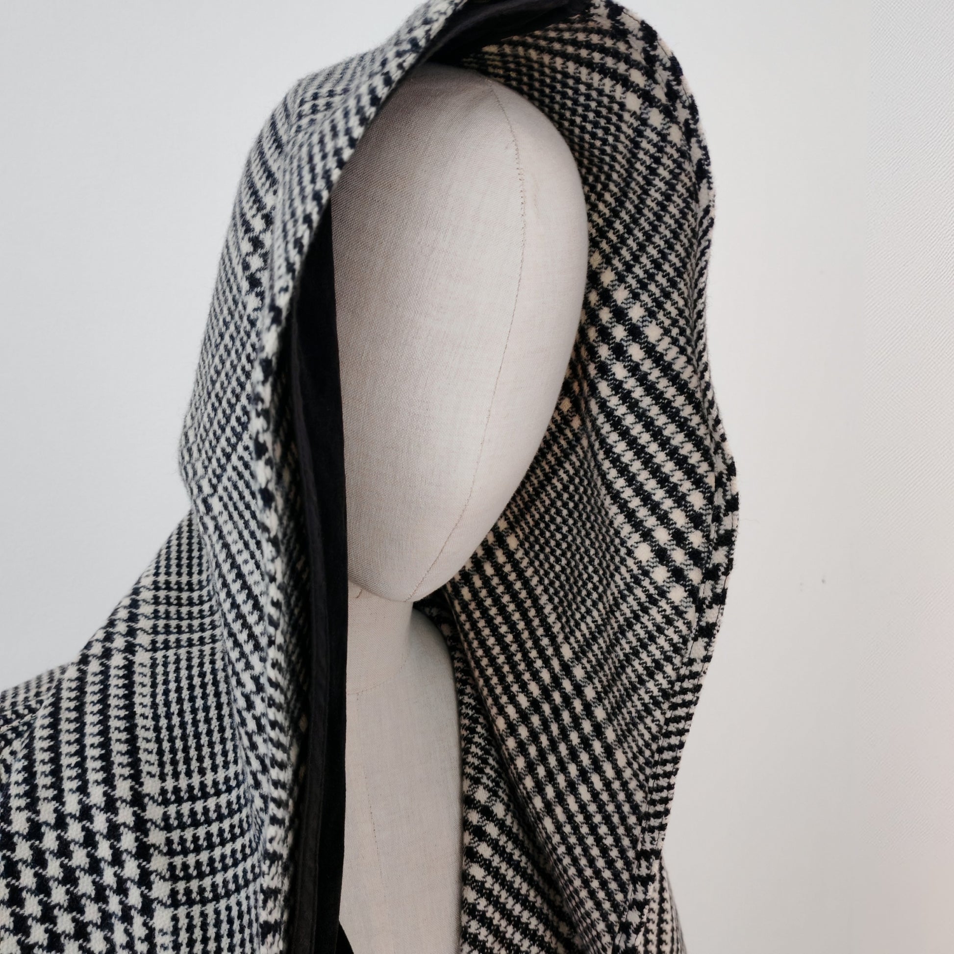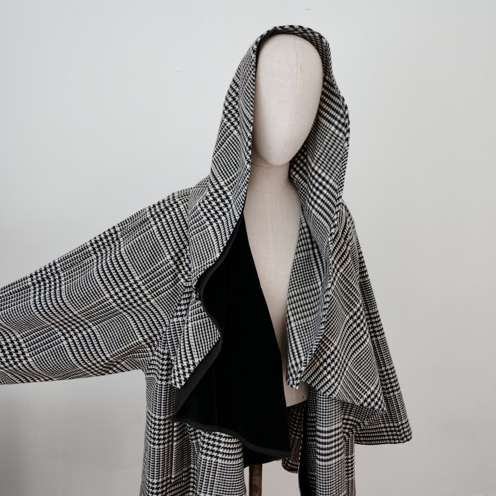 Questo straordinario capo firmato Gianni Versace fa parte della prima produzione dello stilista risalente agli anni 80 come si evince dall’etichetta in font “Avant Garde Light”. Si tratta di un raro pezzo realizzato con un tessuto in lana pied de poule bianco e nero sfoderato e sdoppiato in un lato da un inserto in velluto nero. È riportata una taglia 42 ma il taglio quasi a mezza ruota rende la vestibilità adatta a tutte le taglie. Sono presenti sui fianchi due tasche. Made in Italy