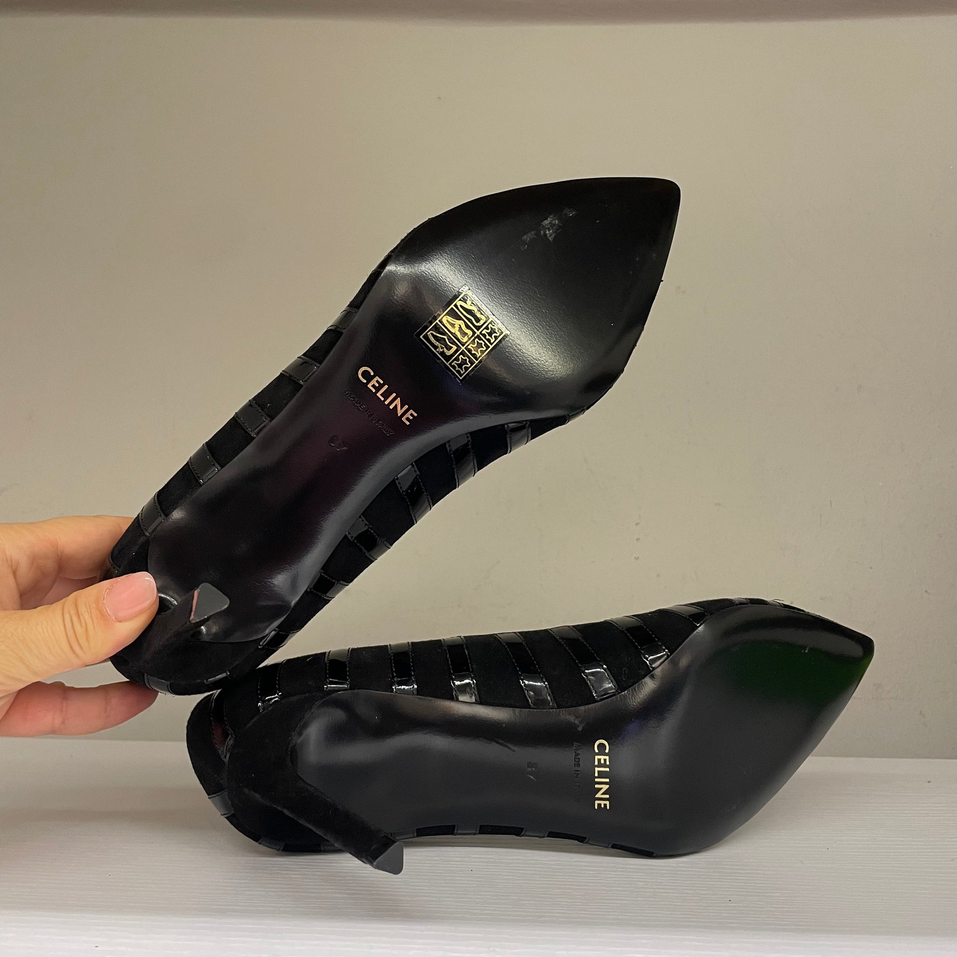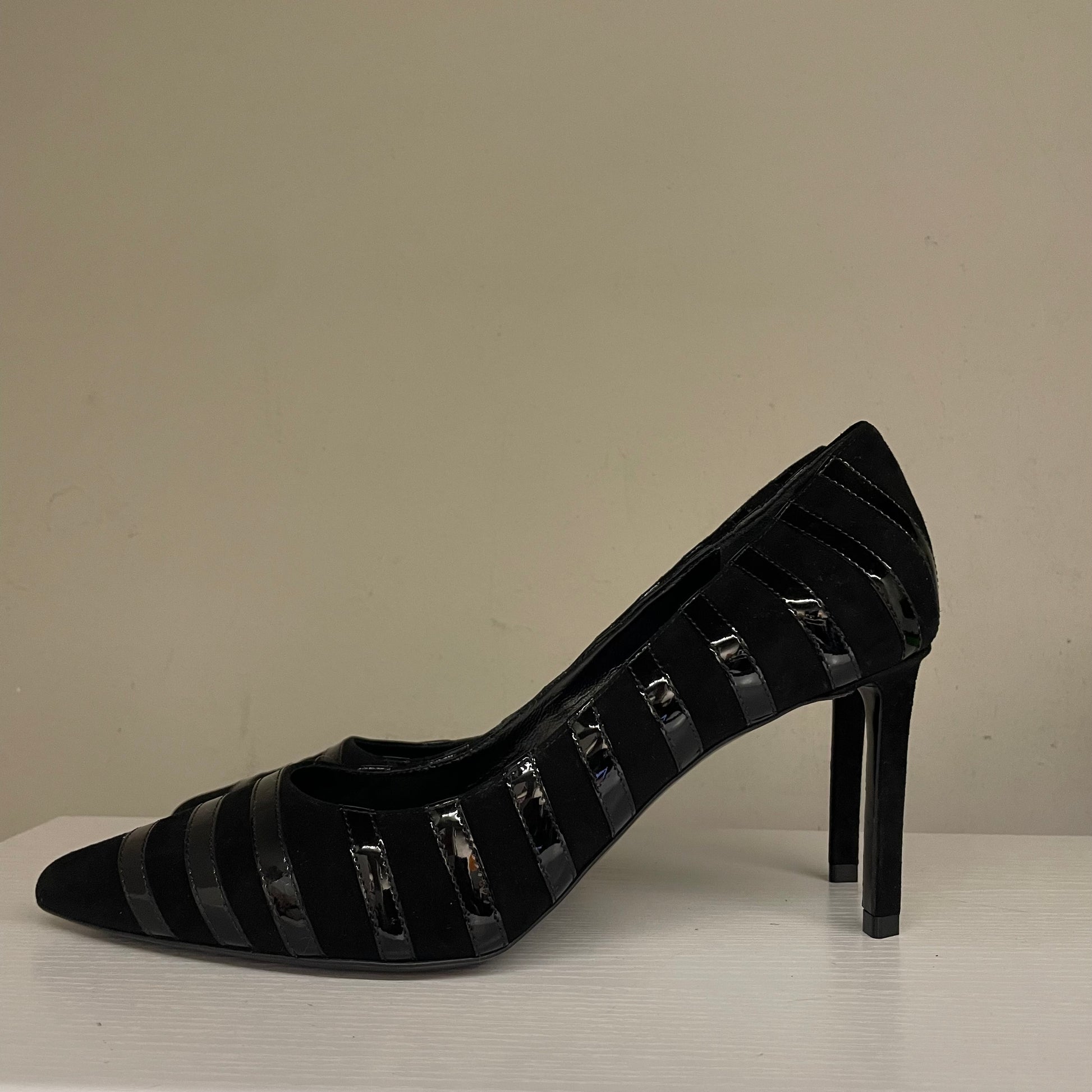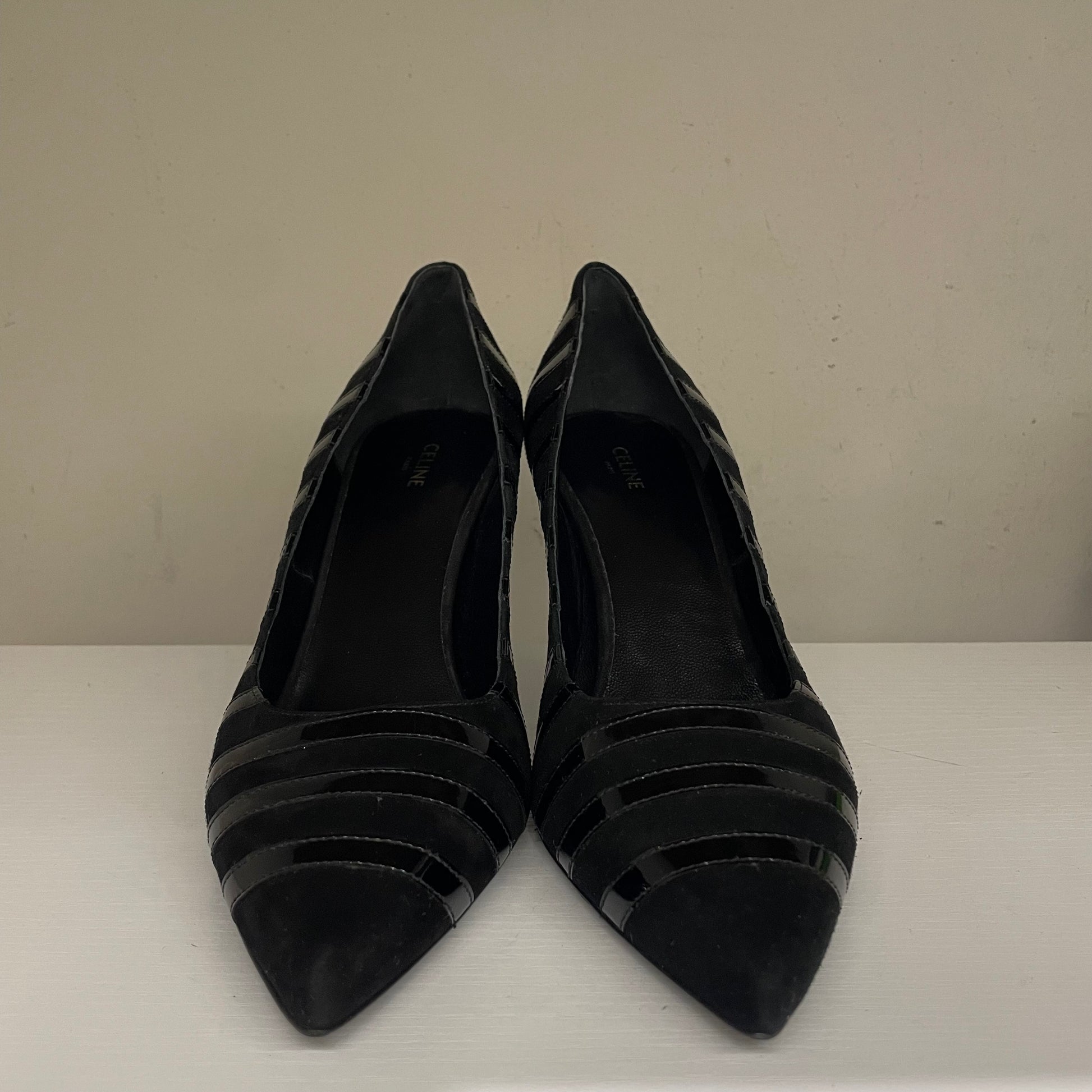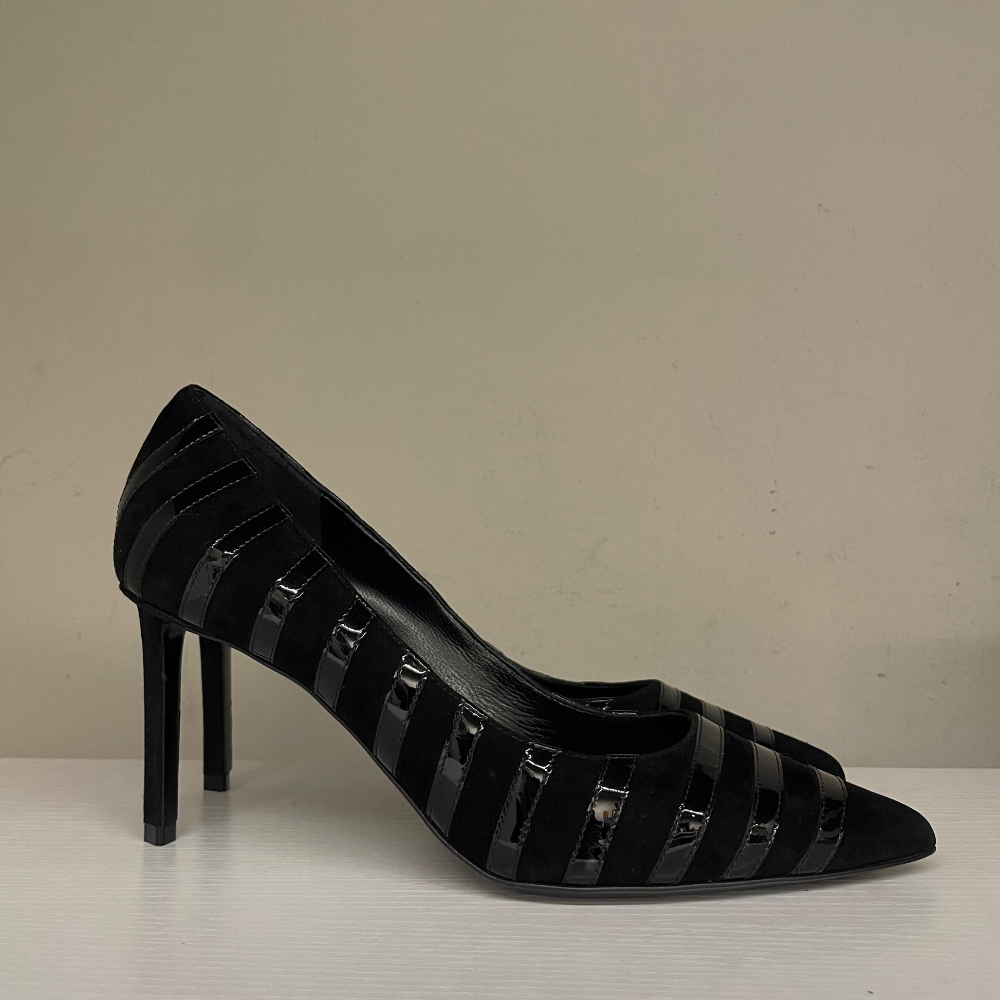 Décolleté CELINE in pelle scamosciata alternata a strisce a pelle verniciata. Colore nero. Altezza tacco 7,5 cm. Sono nuove, senza corredo. Made in Italy