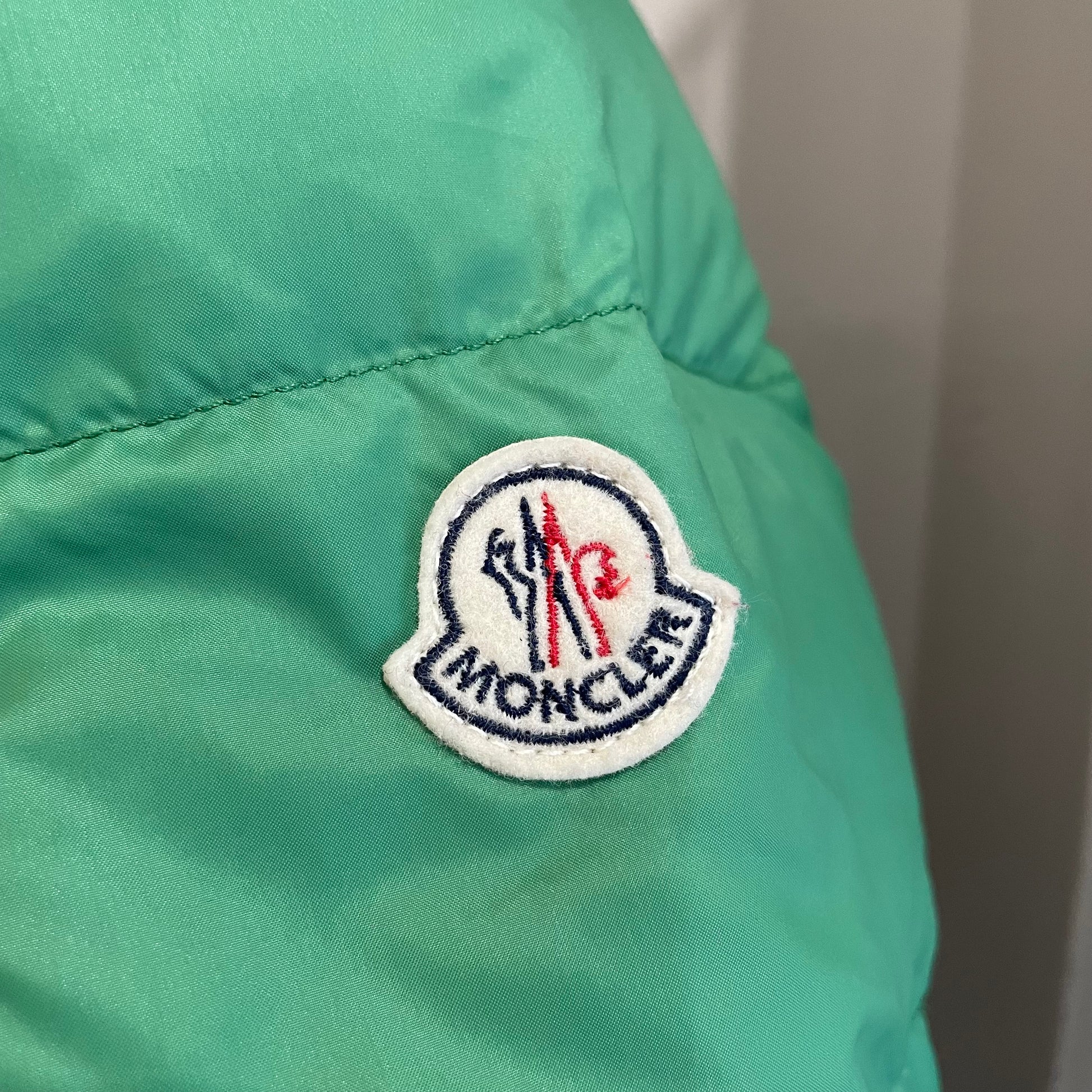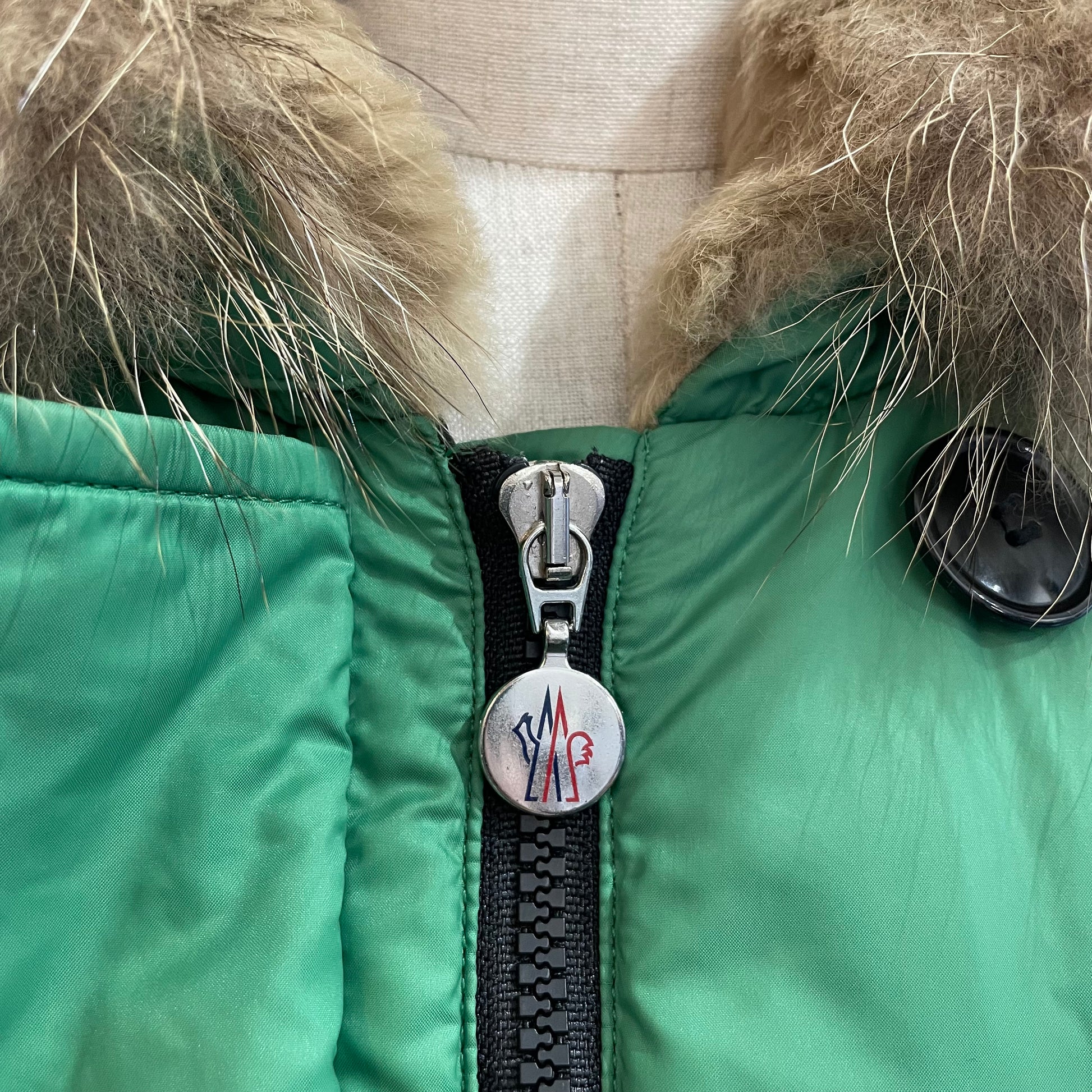 Bomber MONCLER con cappuccio interamente foderato di vera pelliccia. Color verde smeraldo. Imbottitura in vero piumino. Lievi segni.