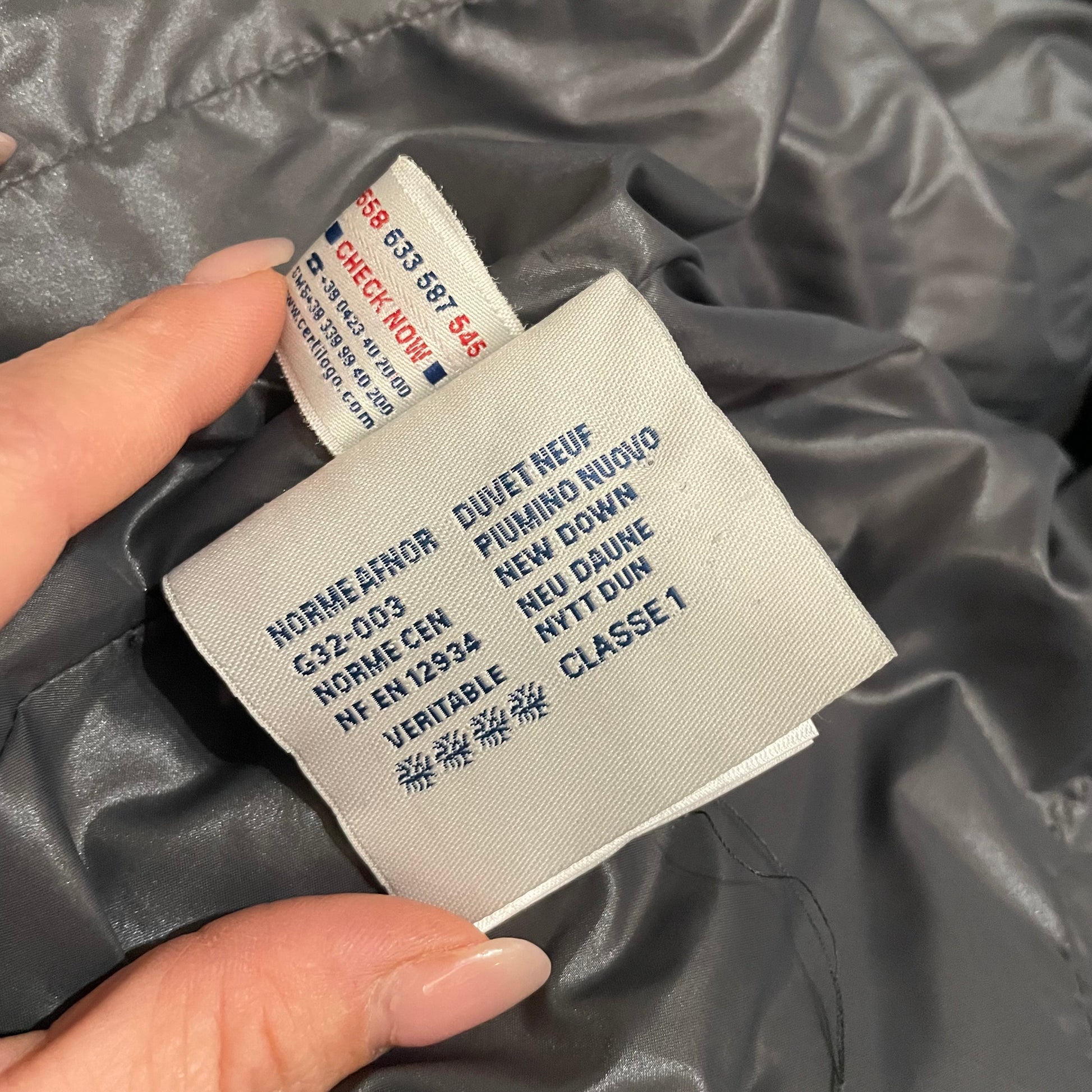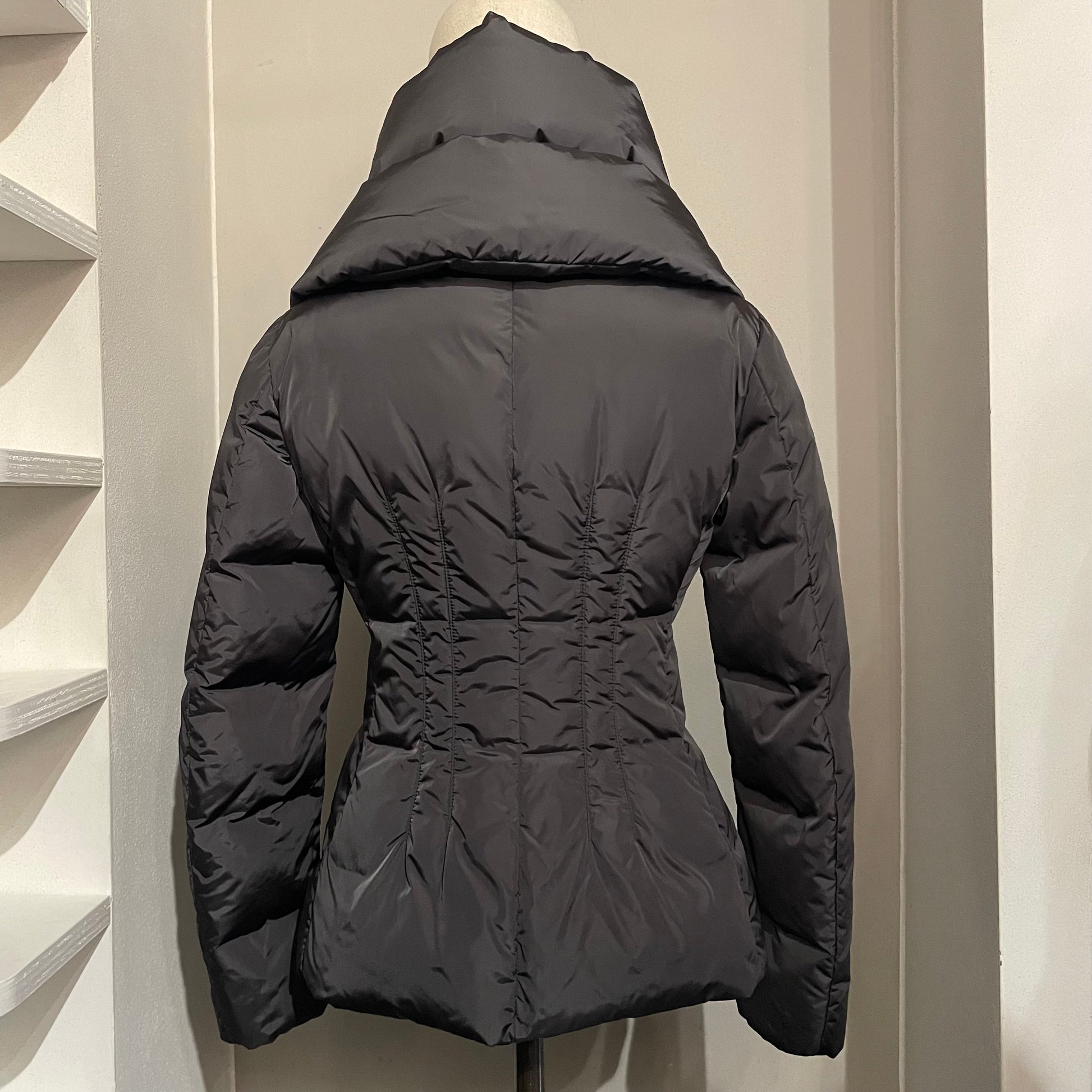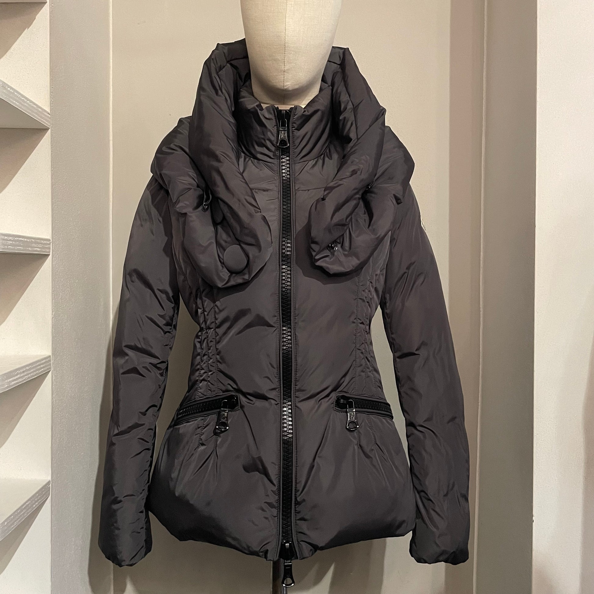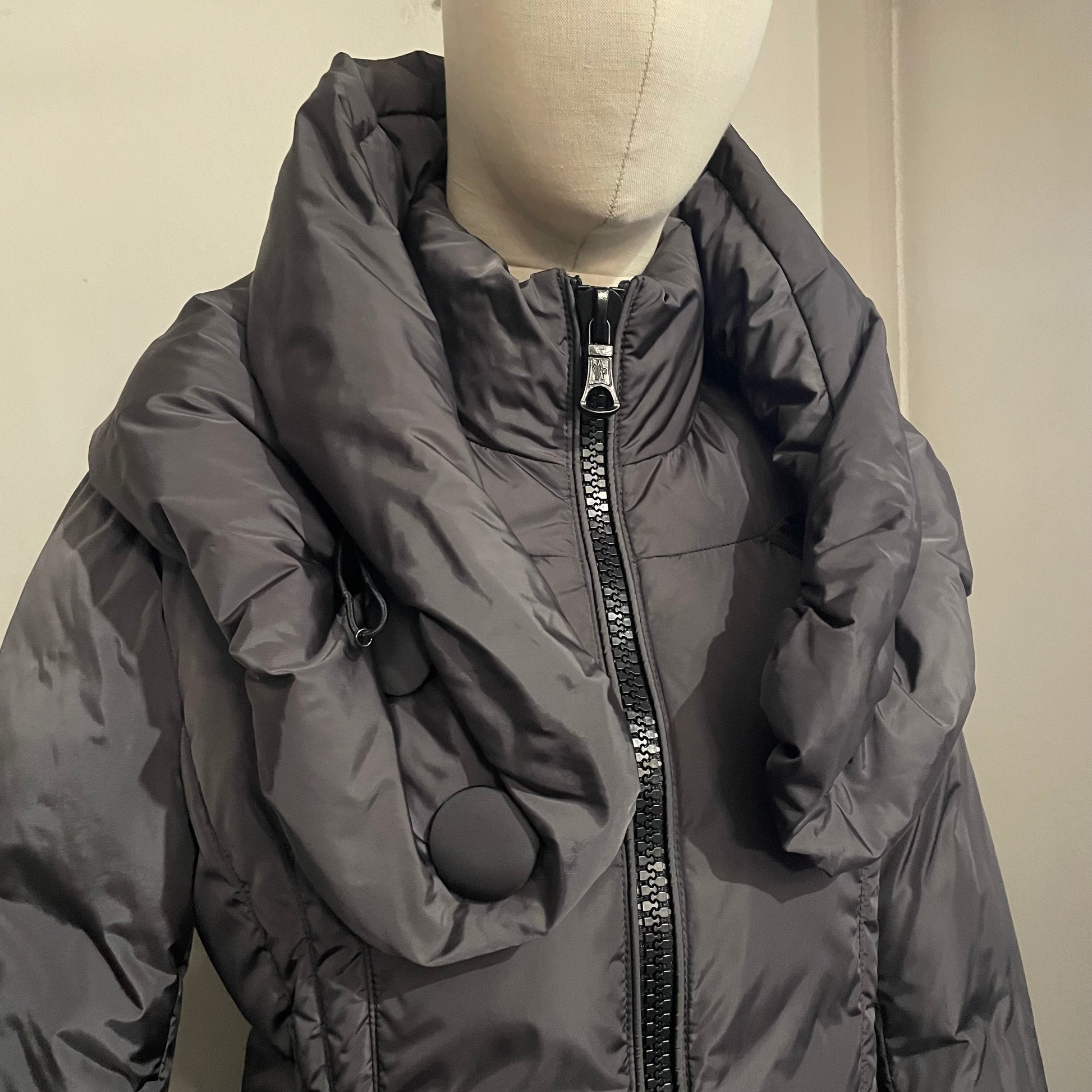 Piumino corto MONCLER colore grigio antracite. Dettagli neri. Grande collo montante. Sfiancato e molto femminile pur restando un capo sportivo.